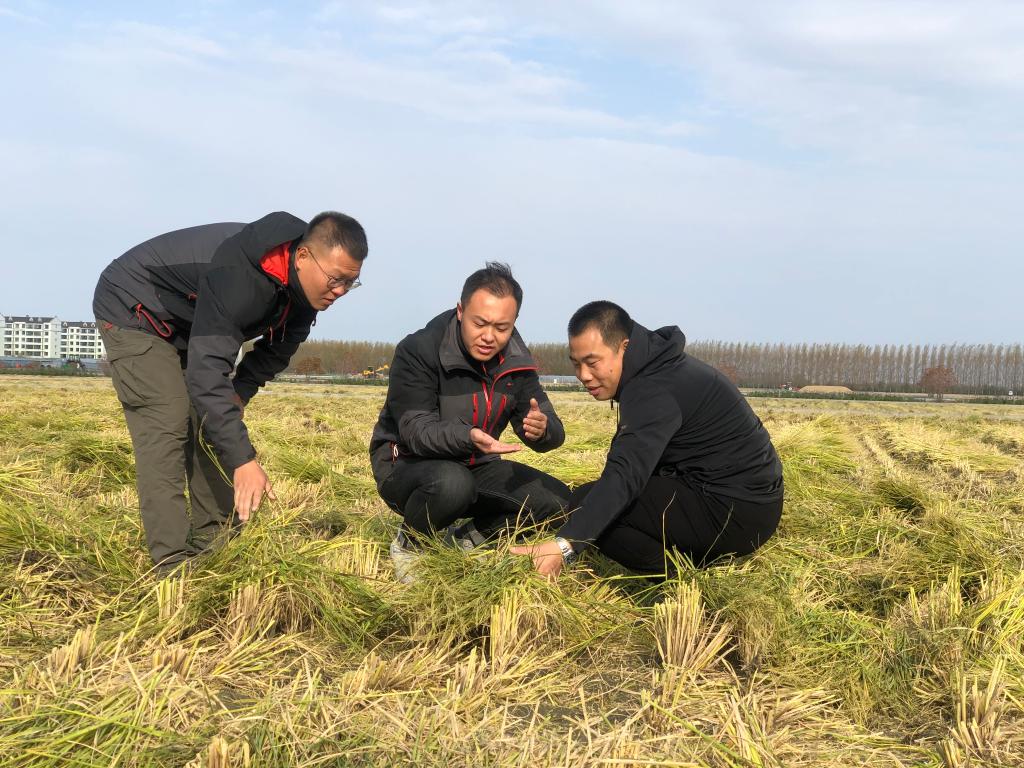 李光旭(中间)在查看收割机收获后机械损失率。(受访者供图)