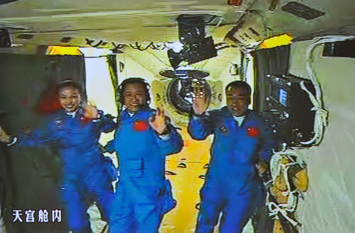 ↑2013年6月13日拍摄的北京航天飞行控制中心大屏幕显示:3名航天员在天宫一号向地面科研人员挥手致意。(新华社记者刘潺 摄)