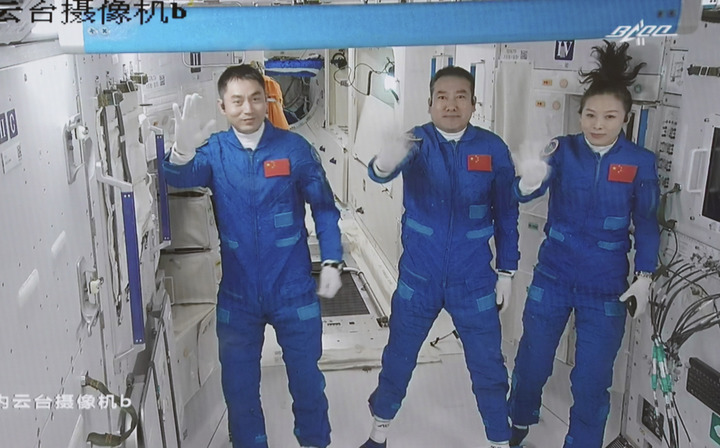↑2021年10月16日在北京航天飞行控制中心拍摄的进驻天和核心舱的神舟十三号航天员翟志刚(中)、王亚平(右)、叶光富向全国人民挥手致意的画面。(新华社记者田定宇 摄)