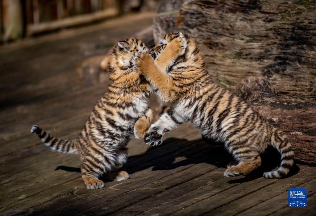 1月30日,云南野生动物园内的两只东北虎幼崽在嬉戏。新华社记者 陈欣波 摄