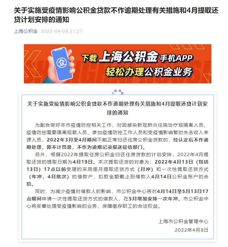为配合做好本市疫情防控相关工作,对因感染新冠肺炎住院治疗或隔离人员、疫情防控需要隔离观察人员、参加疫情防控工作人员和受疫情影响暂时失去收入来源人员,2022年3月至4月期间不能正常归还住房公积金贷款的,经认定后不作逾期处理,即不计罚息,不作为逾期记录报送征信部门。