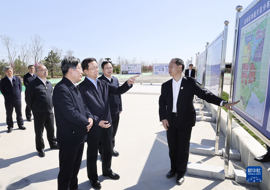 4月15日,中共中央政治局常委、国务院副总理韩正到河北雄安新区调研,主持召开座谈会并讲话。这是韩正来到北京非首都功能疏解项目选址地块,仔细询问首批疏解高校和北京协和医院选址及工作对接情况。新华社记者 庞兴雷 摄