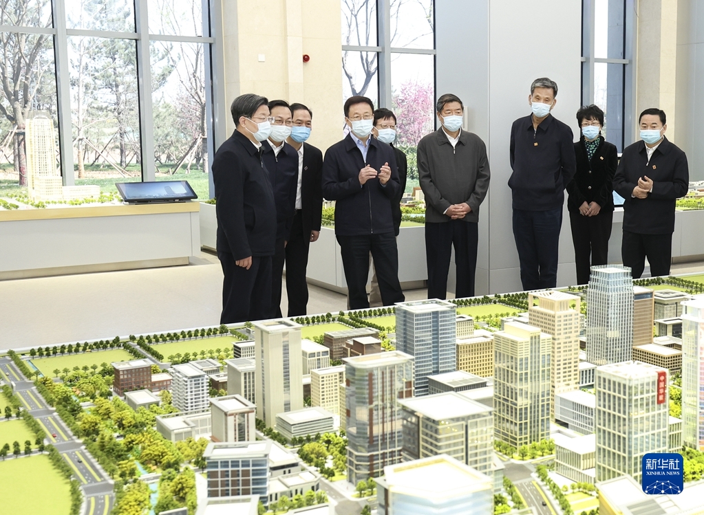 4月15日,中共中央政治局常委、国务院副总理韩正到河北雄安新区调研,主持召开座谈会并讲话。这是韩正走进启动区综合服务中心,观看沙盘、展板和模型,认真听取启动区整体城市风貌、标志性和重要建筑方案设计情况介绍,实地察看“一站式”综合服务现场办公情况。新华社记者 庞兴雷 摄