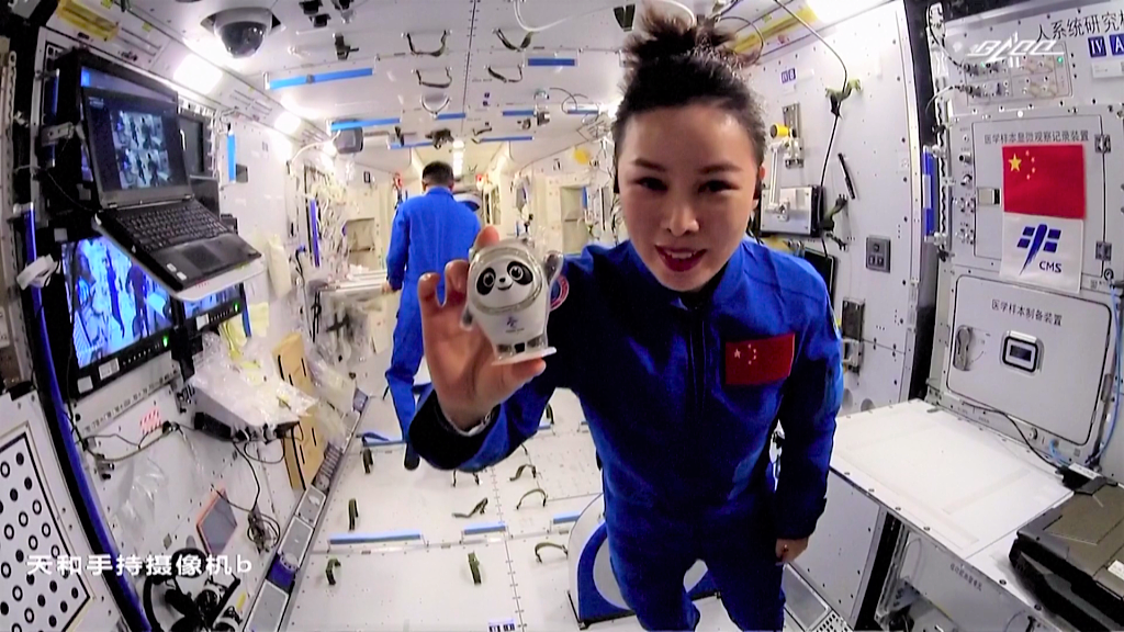 △“天宫课堂”中, 王亚平和“冰墩墩”在中国空间站同框。