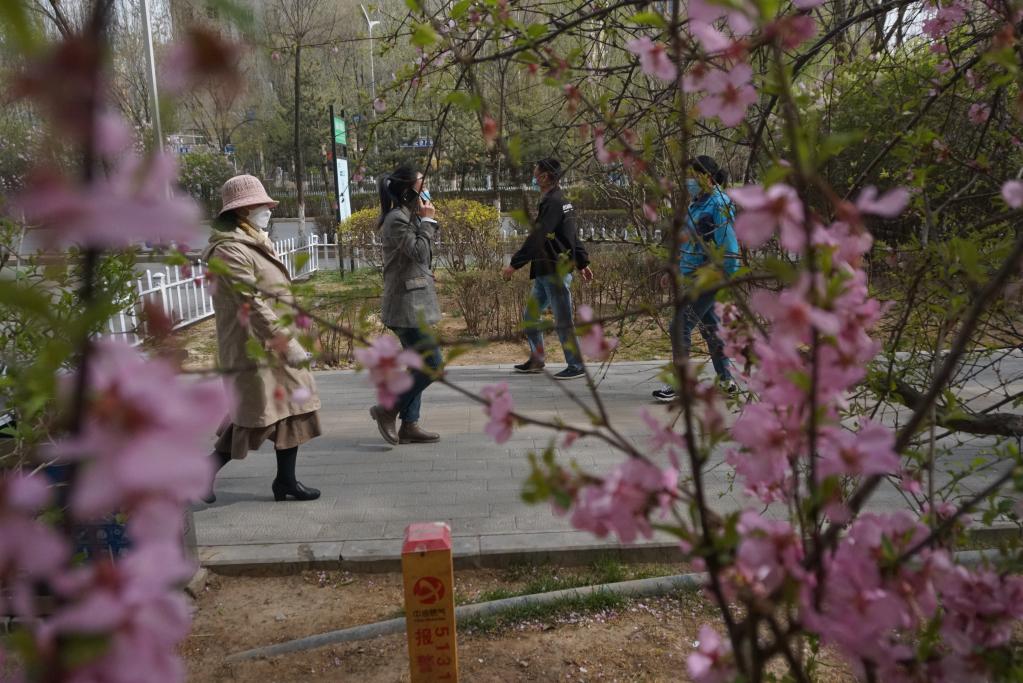 4月23日,在青海省西宁市昆仑西路,市民正在街头散步。(新华社记者 周盛盛 摄)