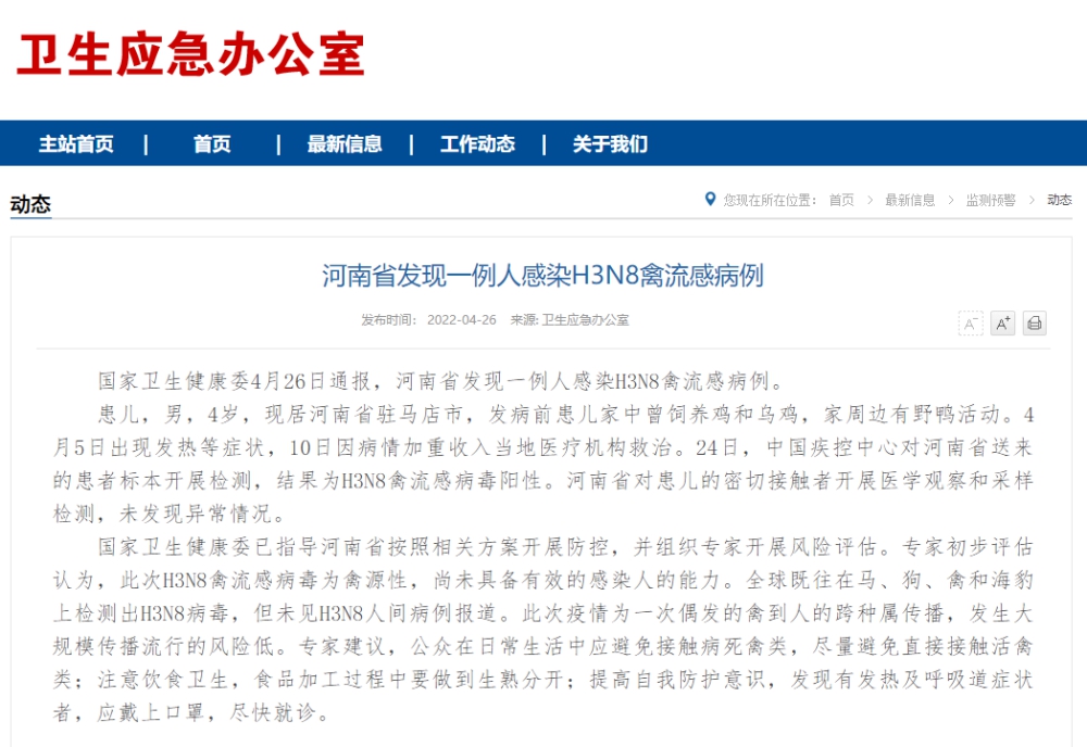 国家卫生健康委4月26日通报,河南省发现一例人感染H3N8禽流感病例。
