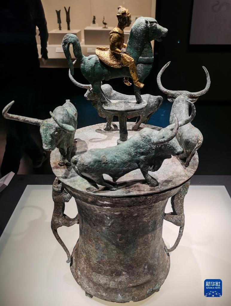 云南省博物馆展陈的四牛鎏金骑士铜贮贝器(3月26日摄)。新华社记者 陈冬书 摄