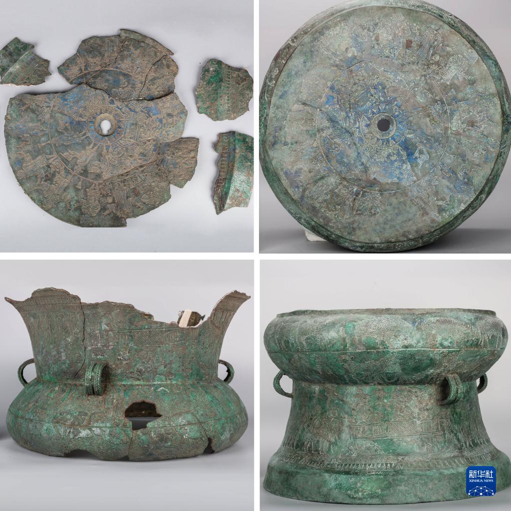 拼版照片:修复前的西汉宴乐籍田铜鼓形铜贮贝器(左上、左下);修复后的西汉宴乐籍田铜鼓形铜贮贝器(右上、右下)(资料照片)。新华社发