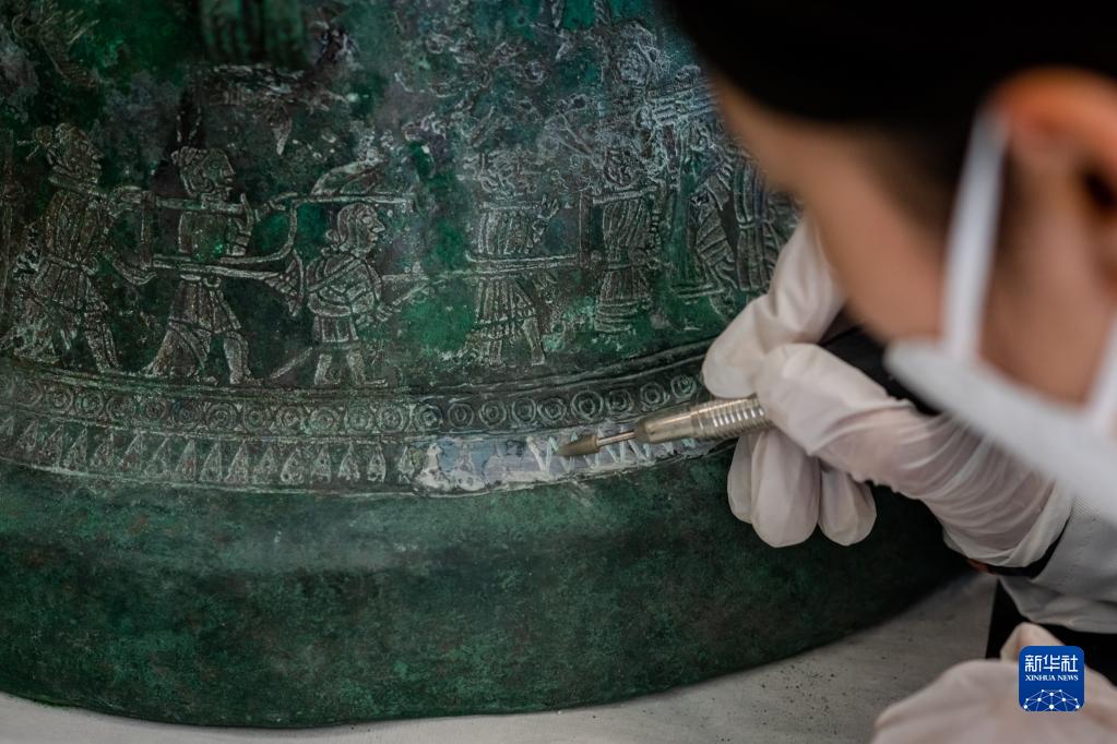 在云南省博物馆,青铜文物保护修复师潘娇对青铜器进行本体保护修复(5月10日摄)。新华社记者 胡超 摄