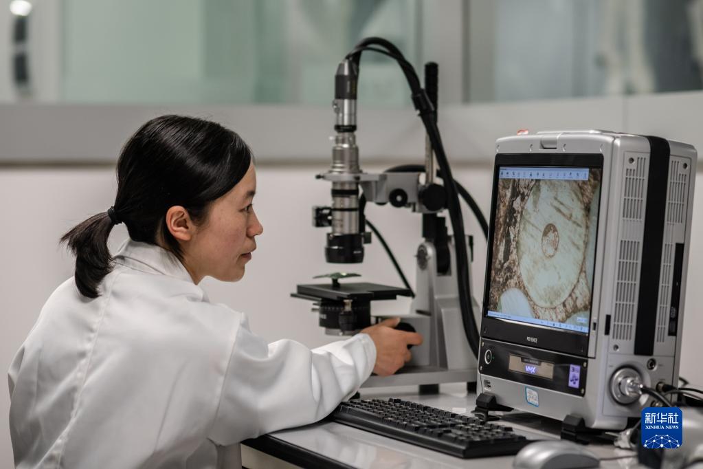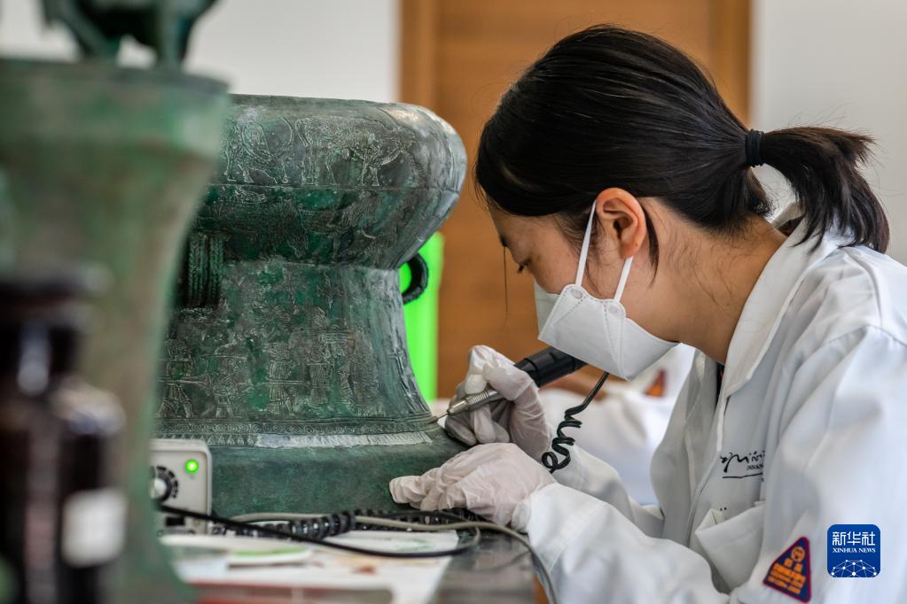 在云南省博物馆,青铜文物保护修复师潘娇对青铜器保存状况进行分析检测(5月10日摄)。新华社记者 胡超 摄