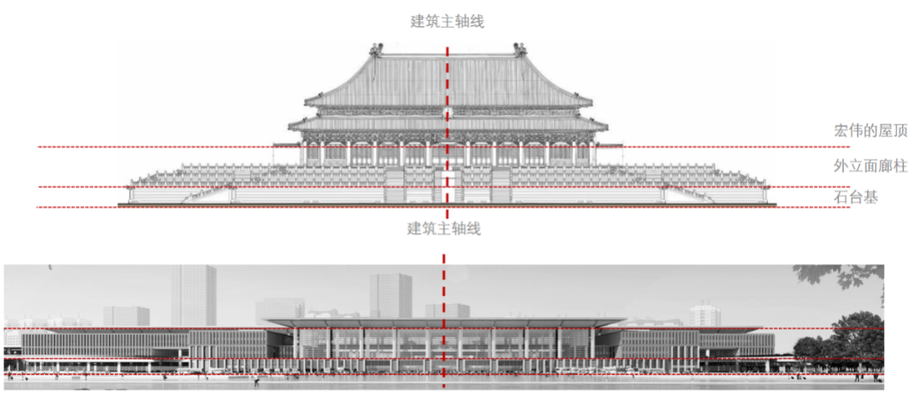 方形建筑坐落在方形台基之上,整体中轴对称,契合中国传统建筑风格。宏伟出挑的屋面挑檐象征中国传统建筑的挑檐,外立面的陶板幕墙肌理对应老北京的砖墙肌理,麦穗黄色的陶板,寓意“丰收、喜庆、辉煌”。