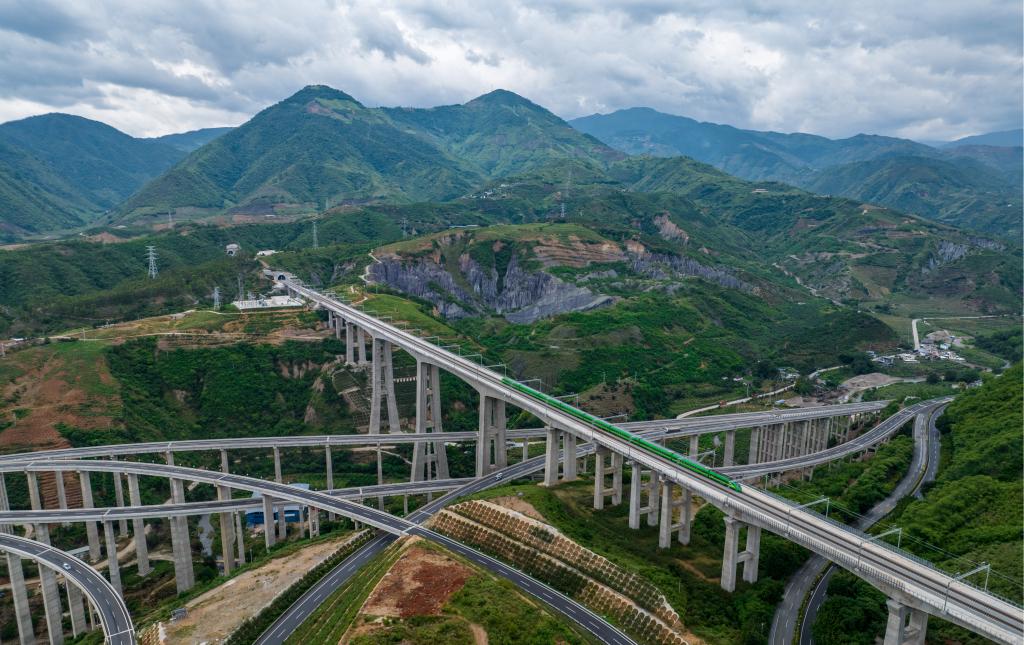 复兴号列车通过中老铁路南溪河特大桥(无人机照片,6月2日摄)。新华社记者 江文耀 摄