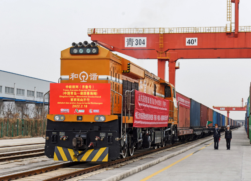 2022年2月18日,中欧班列(齐鲁号)中国青岛—德国曼海姆双向对开首班列车从上合示范区青岛多式联运中心出发。