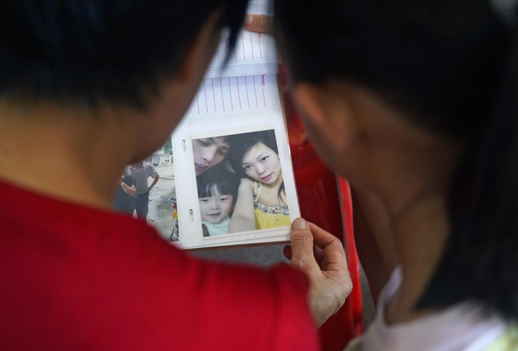 在江西省武宁县鲁溪镇梅颜村,留守儿童毕梓萱(右)和奶奶一起看爸爸妈妈的合影照片。新华社记者 万象 摄