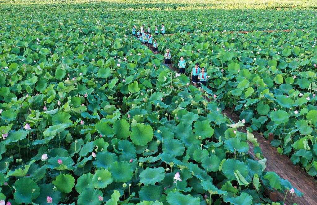 孩子们在江西省武宁县澧溪镇澧溪村的一处荷塘采风写诗。新华社记者 万象 摄