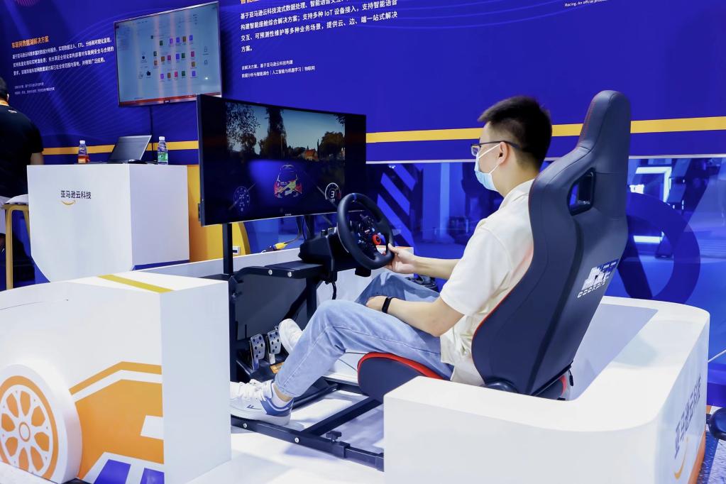 智能网联汽车,不仅需要“聪明的车”“智慧的路”,还要有“协同的云”。记者来到亚马逊云科技展台,体验了一把智能驾驶的乐趣。