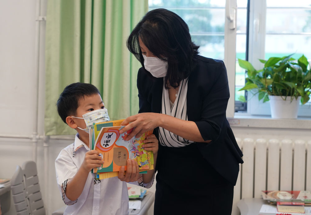 ↑2022年8月30日,人大附中实验小学的老师在分发新学期教材。