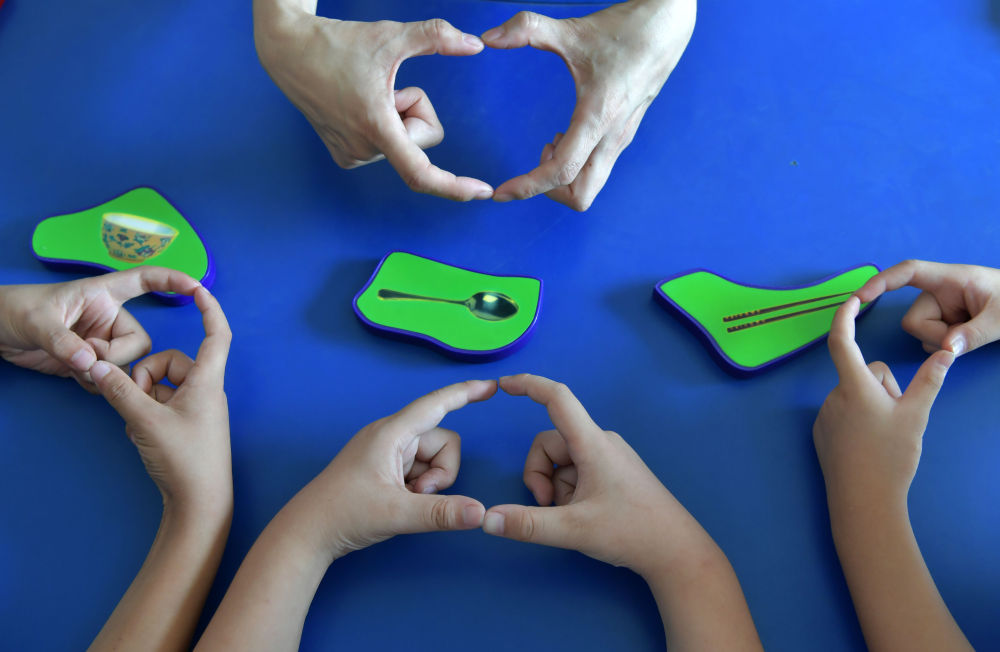 ↑在江西省南昌市启音学校,老师对学生进行语训教学时教授手语(2019年9月18日摄)。