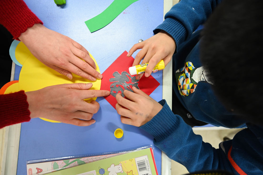 ↑2022年1月18日,在呼和浩特市苏虎街实验小学,老师在指导学生制作新年挂饰。