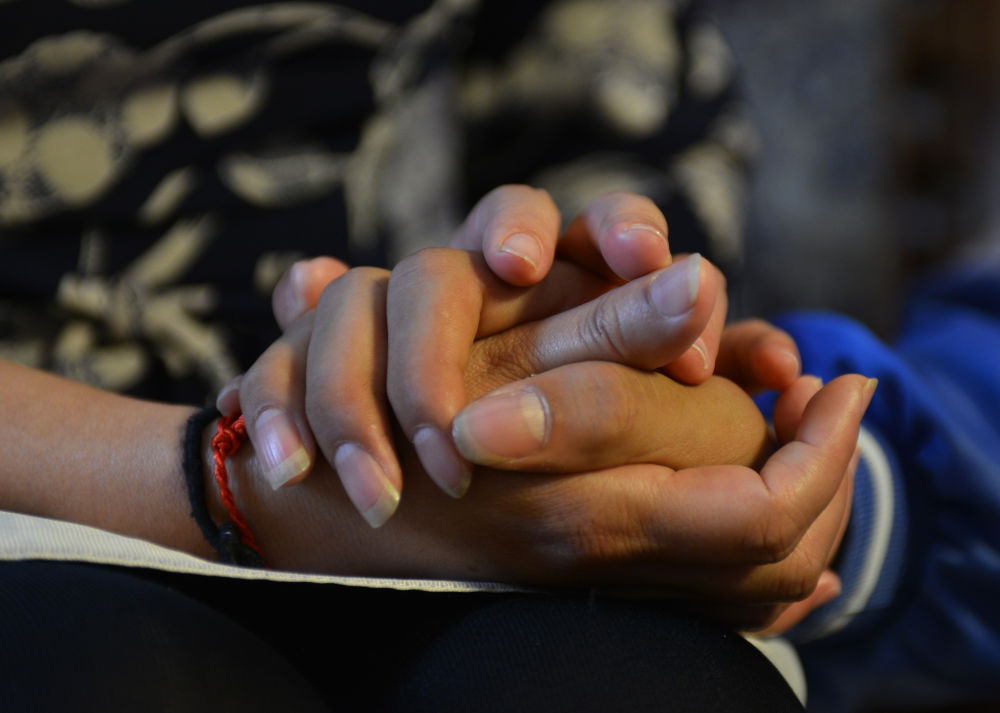 ↑2015年9月28日,贵州盲人女教师刘芳握着学生张仁海的手进行心理辅导。