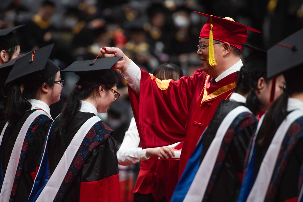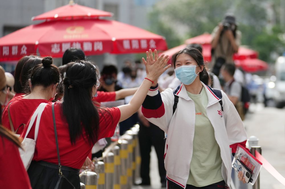 ↑2022年6月7日,在北京市陈经纶中学考点外,考生在进入考点时与送考老师击掌。