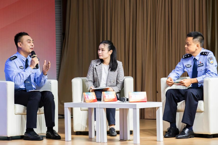 邓君参加广东省梅州市公安局客都警务小讲堂活动,以记者的视角现场提问,与进行分享的民警进行交流。