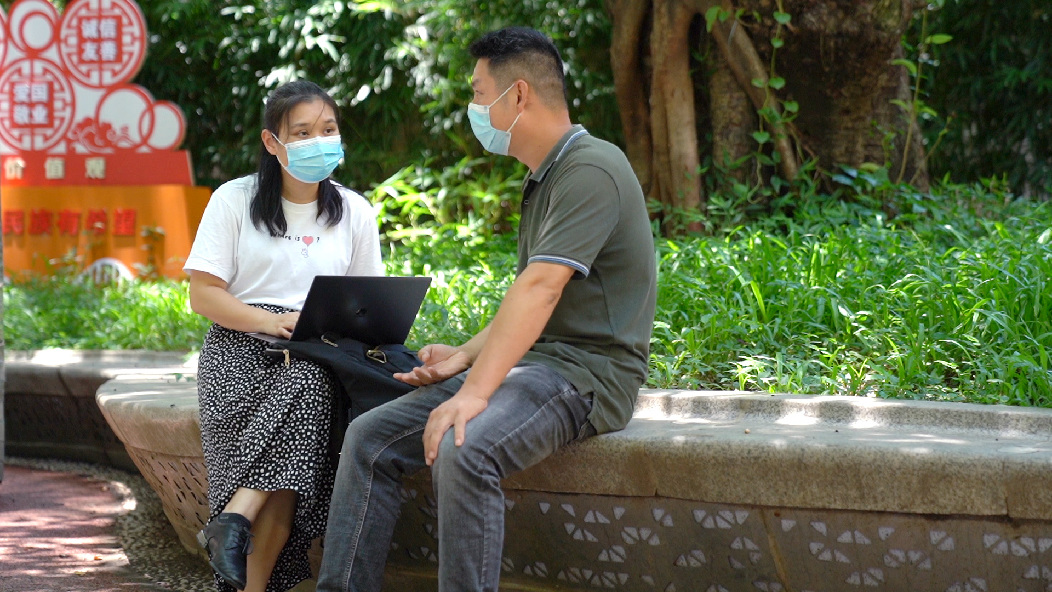 邓君在广州街头采访参与平安建设的“广州街坊。”