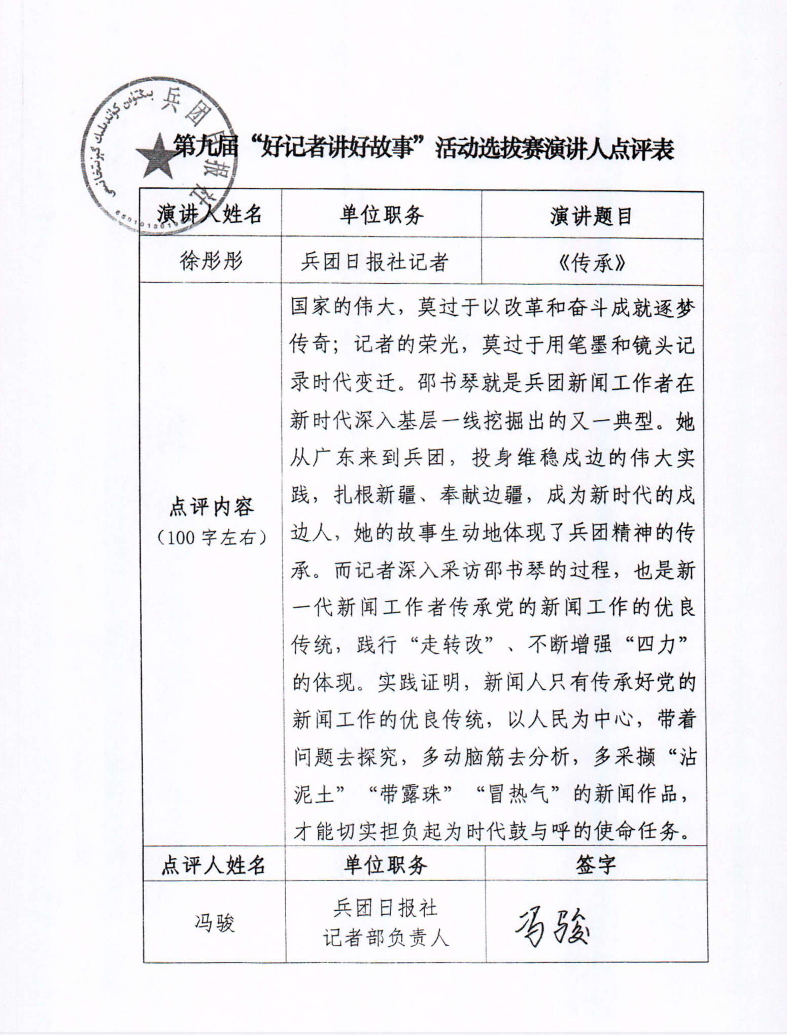 大家好,我叫徐彤彤,来自兵团日报社。许多人听到“兵团”都会产生疑惑,什么是兵团?兵团在哪儿?兵团有什么?在记者的岗位上工作了7年,我感受到,兵团是一种精神,一种“我为祖国守边防”的精神;兵团是一种情怀,一种“献了青春献子孙,献了子孙献终生”的情怀;兵团是一段岁月,一段让“戈壁变良田,沙漠变绿洲”的峥嵘岁月。