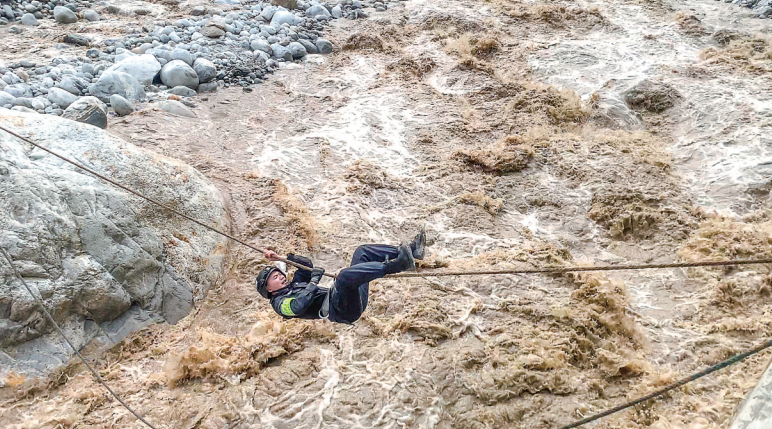 焦虑之际,另一组队员沿河搜寻发现一块离河对岸较近的巨石,率先过河的战友打锚点接应,很快在两边架起一座“飞索桥”,曾经当过高山向导的王万锐第一个冲上去,四肢倒挂,背对激流,飞快移向对岸。紧接着,队员沙马泽呷跃上飞索。钢索和飞索两路同时过河,队伍很快全部来到对岸。