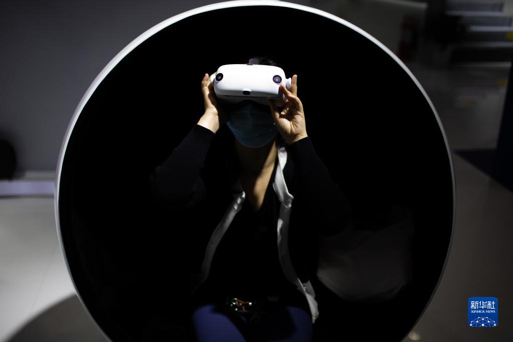 在第四届进博会技术装备展区,参观者在体验超临场感3D虚拟视频(2021年11月7日摄)。新华社记者 金立旺 摄