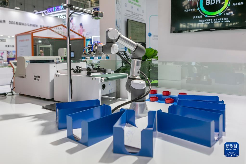 德勤公司在第三届进博会服贸展区全球首发能完成发票分拣与盖章工作的财务机器人手臂(2020年11月5日摄)。新华社记者 王翔 摄