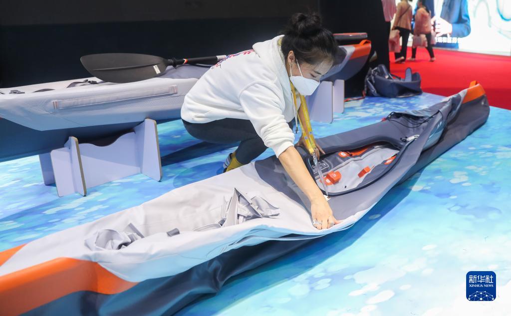 工作人员在第三届进博会消费品展区的迪卡侬展台演示可折叠皮划艇如何安装(2020年11月6日摄)。新华社记者 丁汀 摄