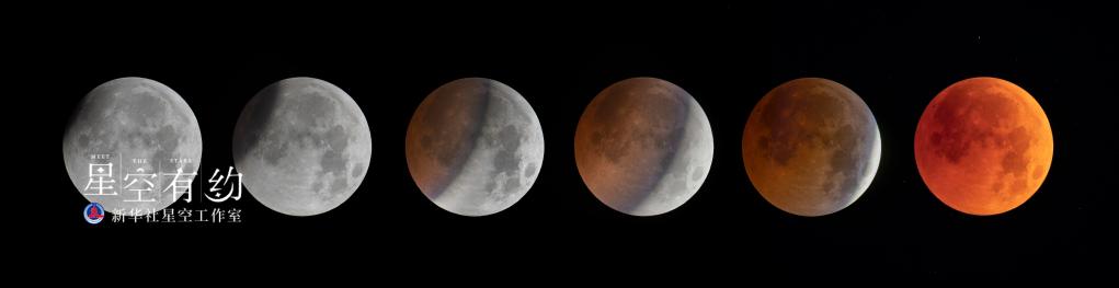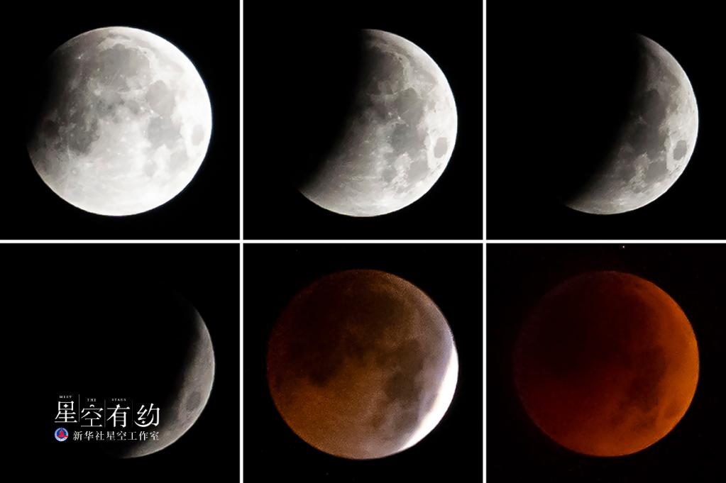 这是北京市天文爱好者马劲2018年7月28日在内蒙古自治区乌兰察布市拍摄的月全食过程(拼版照片)。(本人供图)