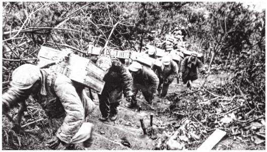 志愿军后勤部队战士背负百余斤弹药箱,翻山越岭,保障前线战斗。丹东抗美援朝纪念馆供图