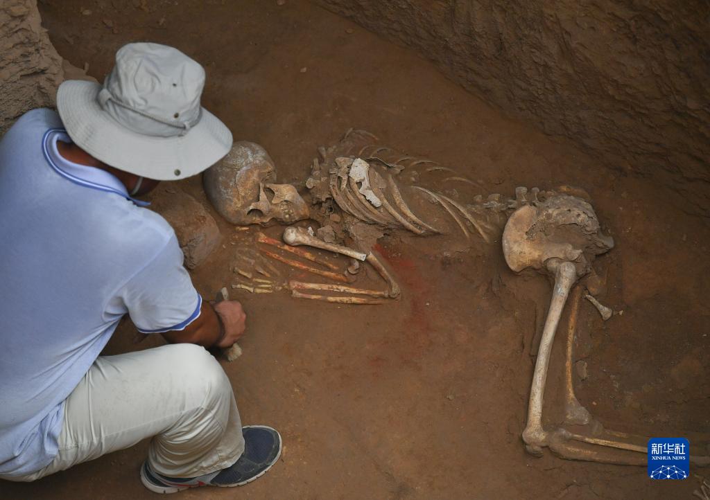 考古人员在石峁遗址皇城台发现的高等级墓地中进行发掘(2022年8月6日摄)。新华社记者 张博文 摄