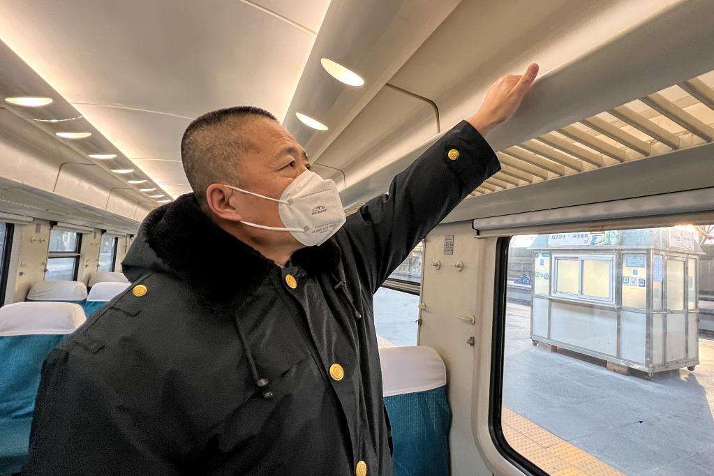1月10日,赵鹏的父亲赵泽强在列车上进行检查工作。(受访者供图)