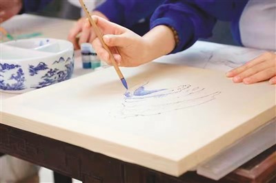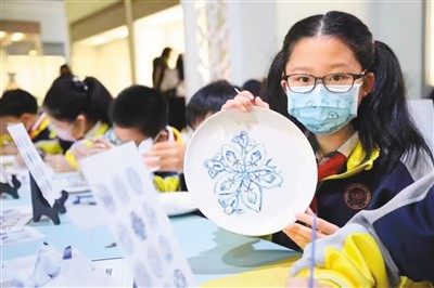 河西区台湾路小学学生展示在《幽菁可爱的青花瓷》课程中绘制的纹饰。王雪乾摄