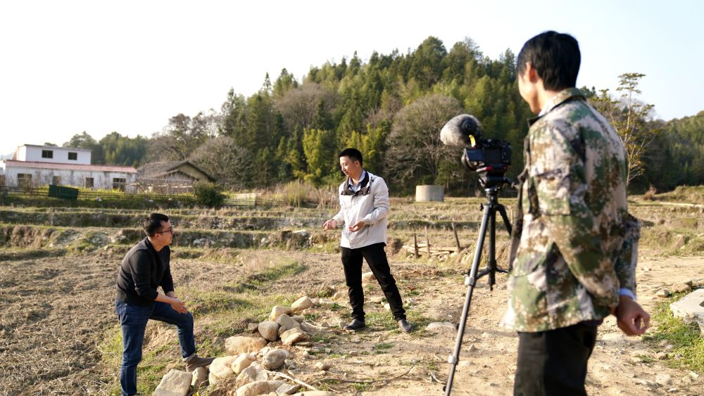 2023年3月15日,新华社记者黄浩然与华农兄弟一起在江西全南县拍摄短视频。
