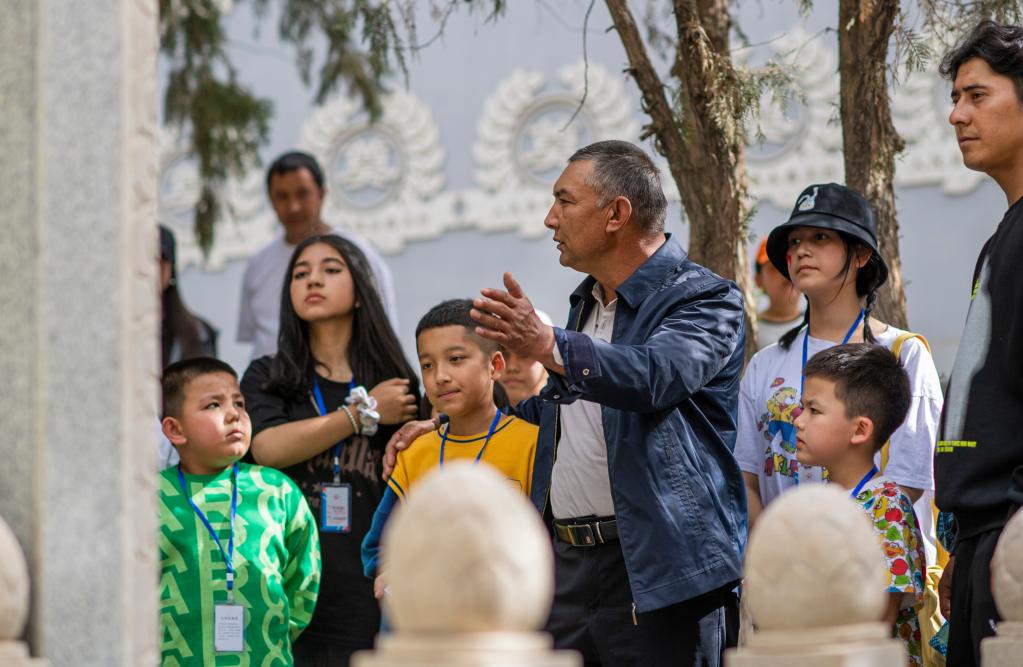 4月16日,在叶城烈士陵园,艾尼瓦尔·艾买尔(右四)为小朋友讲述英雄事迹。