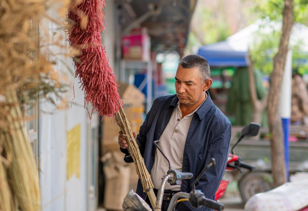 4月16日,在叶城一处农贸市场内,艾尼瓦尔·艾买尔挑选用来清扫陵园的扫帚。