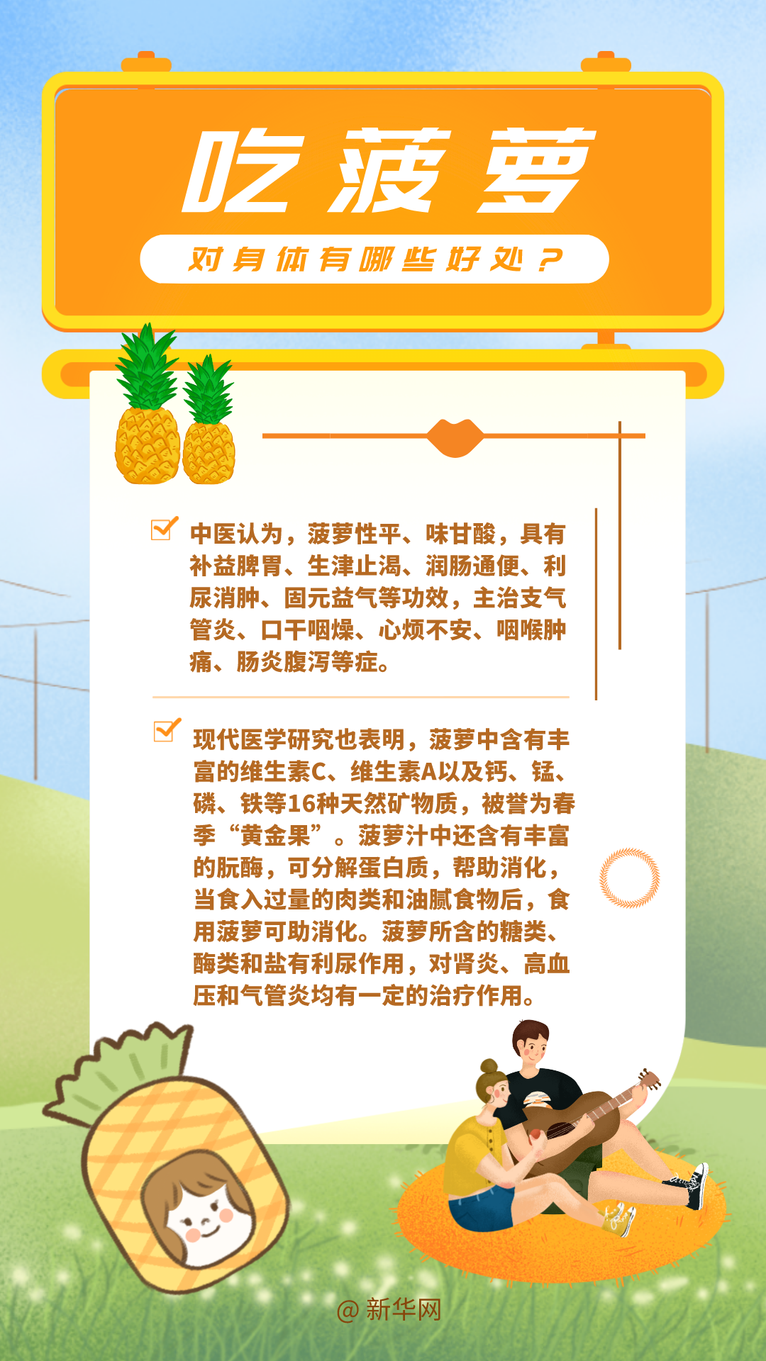 当前正是吃菠萝的季节。不论是在商超水果区还是在街边水果摊,都能看到菠萝的身影。在感受菠萝酸酸甜甜独特口感的同时,菠萝扎嘴也让不少人感到不适。吃菠萝对身体有哪些好处?广受欢迎的菠萝又有哪些食用禁忌?怎么能让菠萝不扎嘴?今天的春日健康帖带大家一起了解。