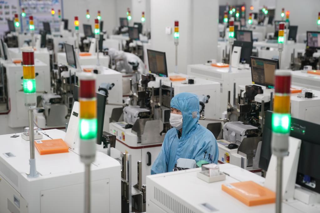3月9日,华天科技(南京)有限公司技术人员对自动化焊线设备进行调试。新华社记者季春鹏 摄