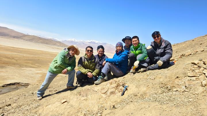 科考队员与本次发现的喜马拉雅鱼龙化石。采访对象供图。