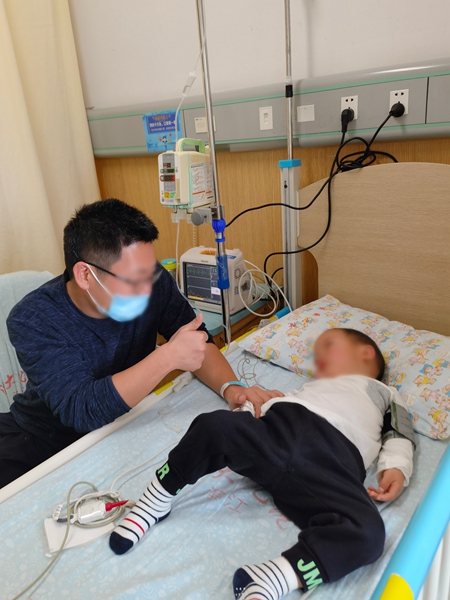 用药时,父亲向端端竖起大拇指鼓励。图片由受访者提供