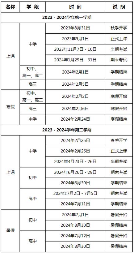 新学期开学时间:秋季学期,高三年级于2023年8月24日开学;其他年级(含幼儿园)于8月31日报名,9月1日正式上课。