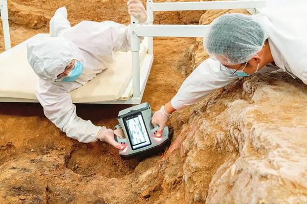 考古工作者在北白鹅墓地地下考古方舱中采集提取信息