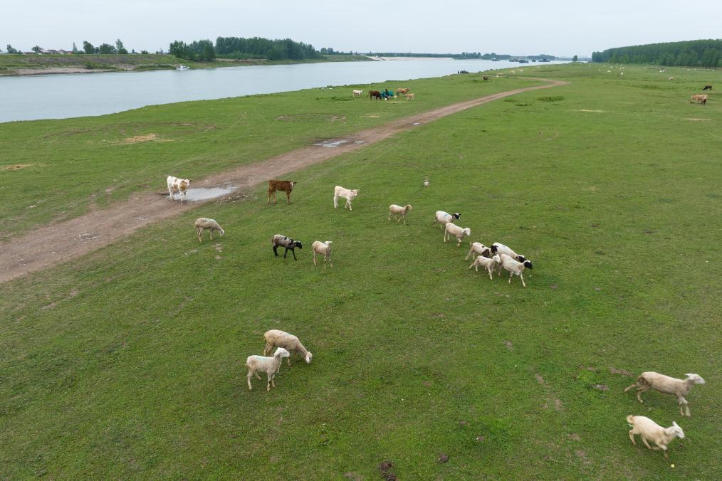 百里洲牛羊正在觅食(2023年5月22日摄,无人机照片)。新华社记者肖艺九 摄