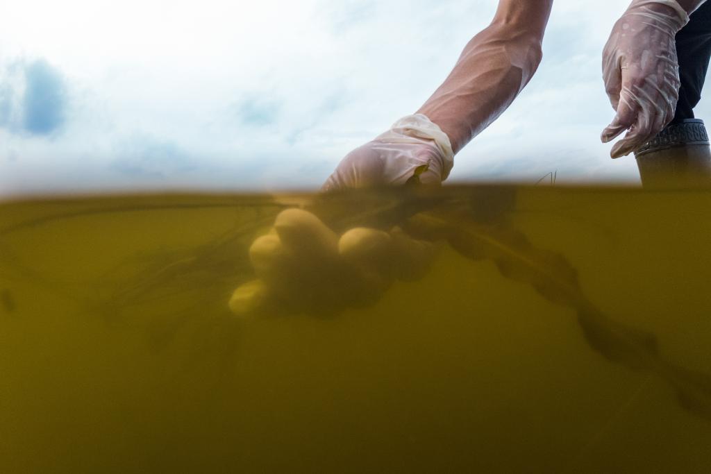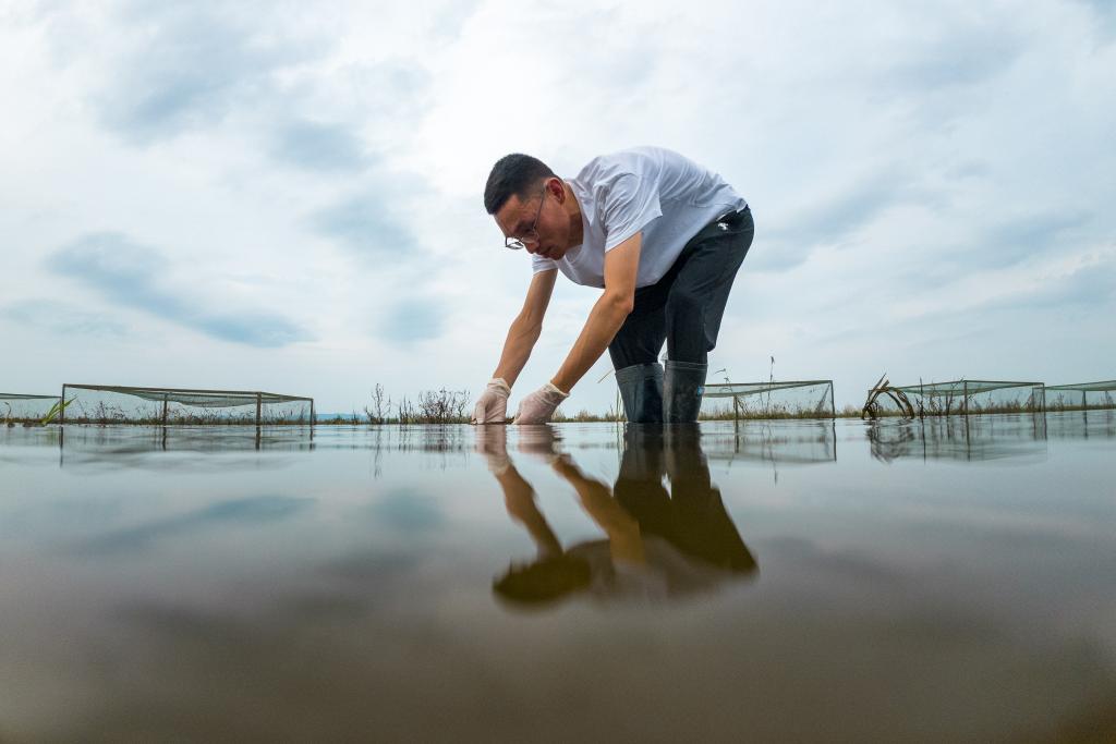 ↑7月9日,中国科学院洞庭湖湿地生态系统观测研究站科研人员巢传鑫博士在湖南东洞庭湖国家级自然保护区查看种植的沉水植物生长情况。
