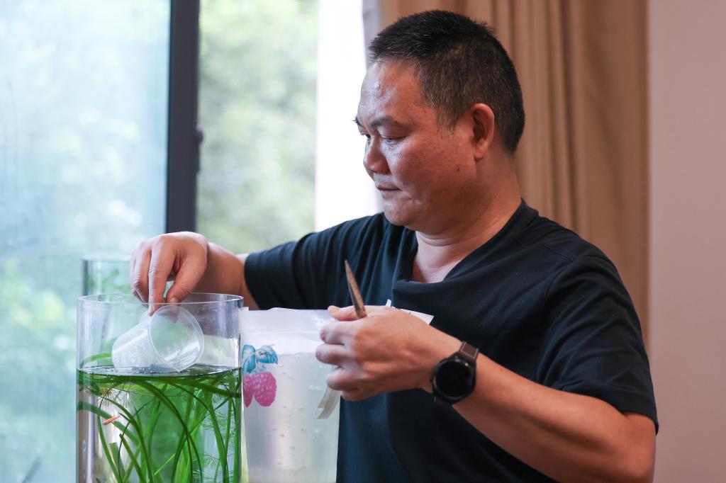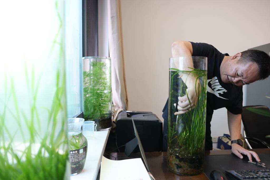 ↑7月8日,中国科学院洞庭湖湿地生态系统观测研究站站长谢永宏在位于湖南省长沙市的中国科学院亚热带农业生态研究所的办公室内修剪种养的沉水植物。
