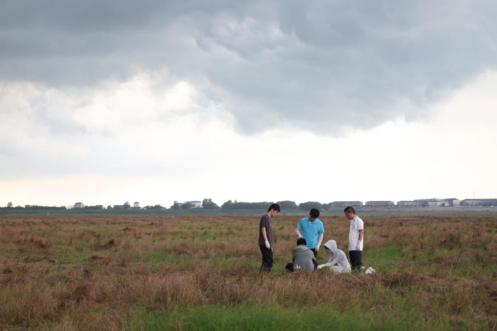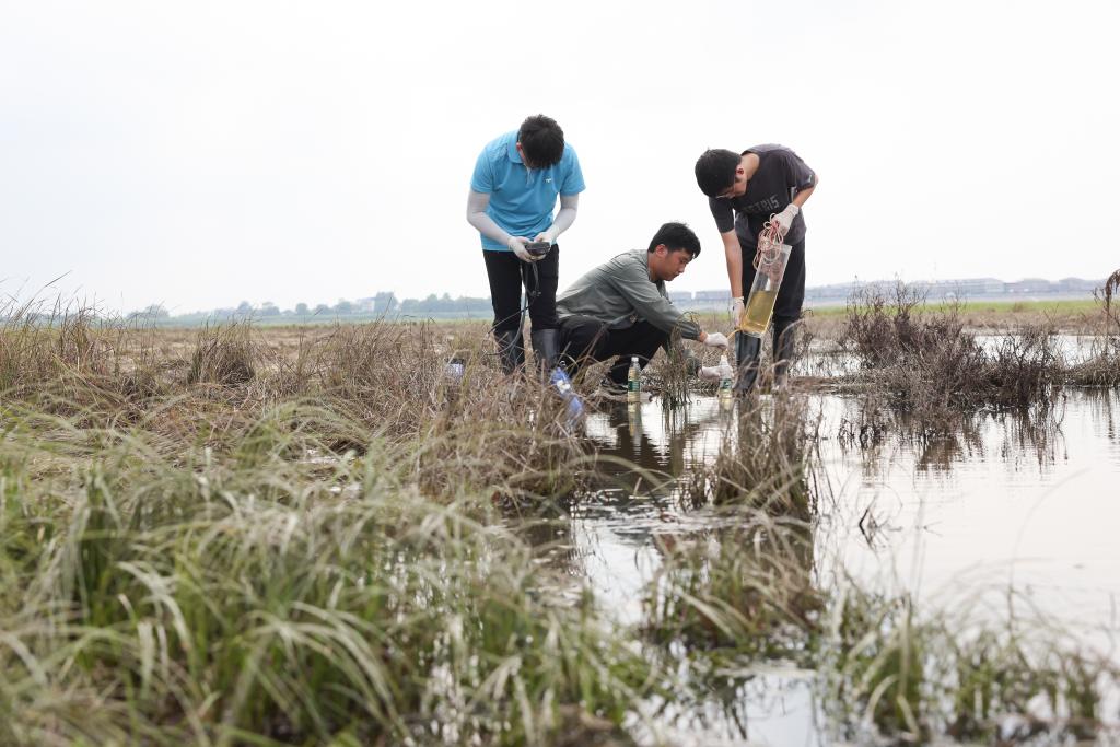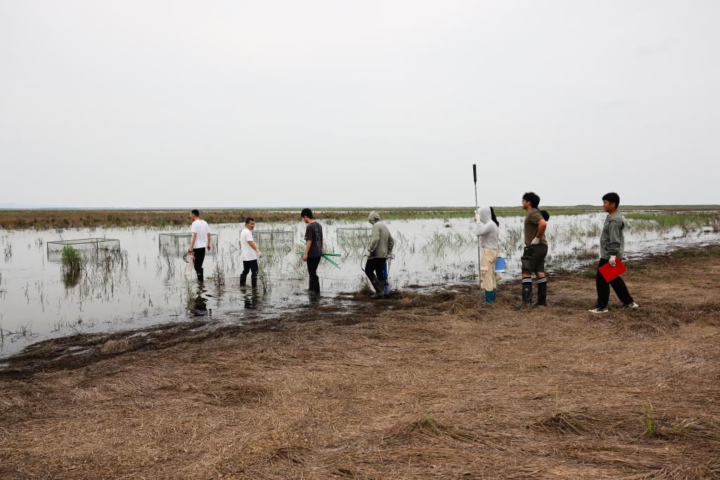 ↑7月9日,中国科学院洞庭湖湿地生态系统观测研究站科研人员邹业爱博士(右一)和学生在湖南东洞庭湖国家级自然保护区采样。